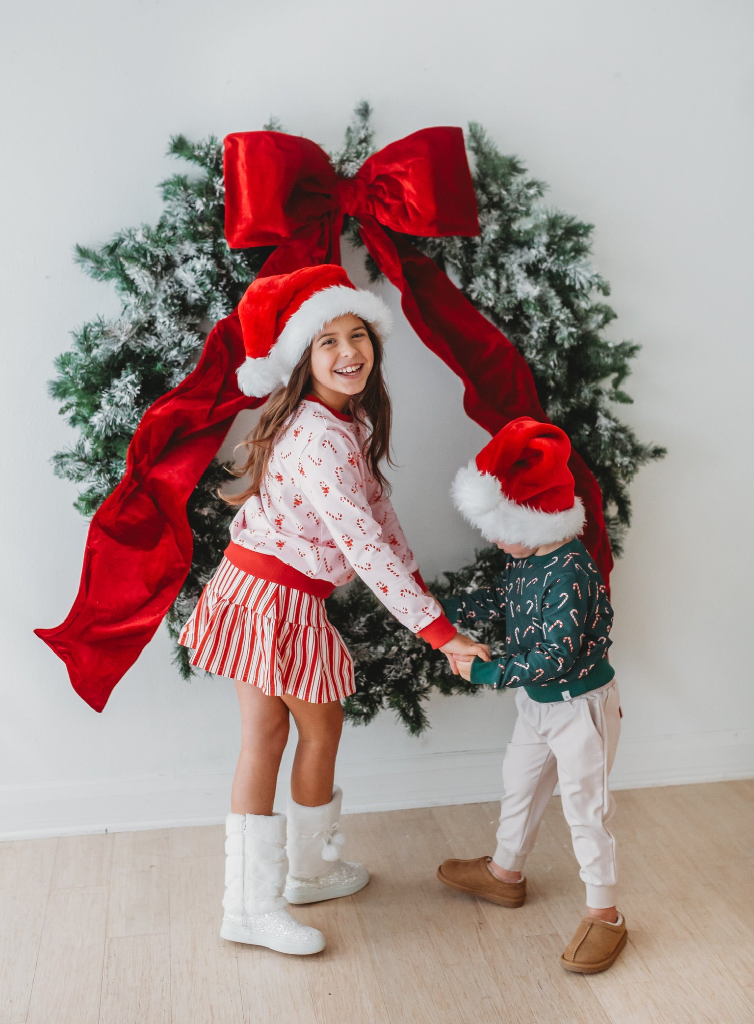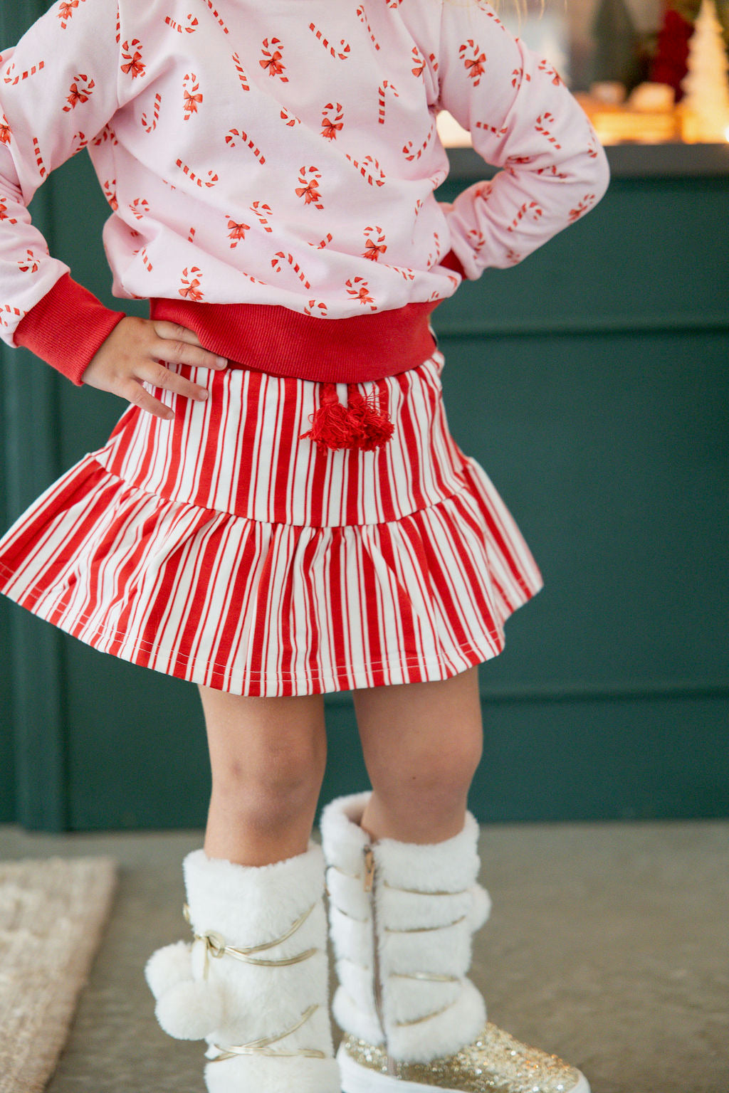 Celebrate the season in style with this Peppermint Parade Sweatshirt and Skort Set! Featuring a cozy candy cane-striped skort paired with a fun candy cane print sweatshirt, it’s the perfect festive outfit for holiday fun. Soft, comfy, and delightfully playful, this set brings cheerful charm to any Christmas gathering or winter outing. Get ready to twirl and spread holiday joy with every step!