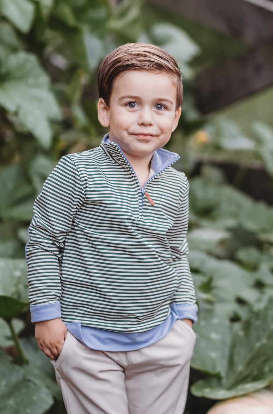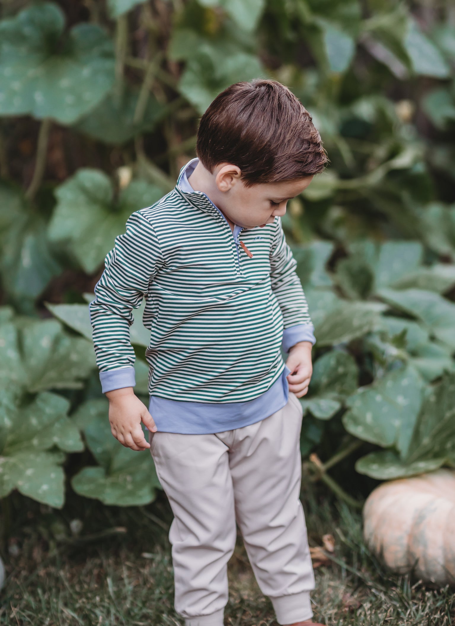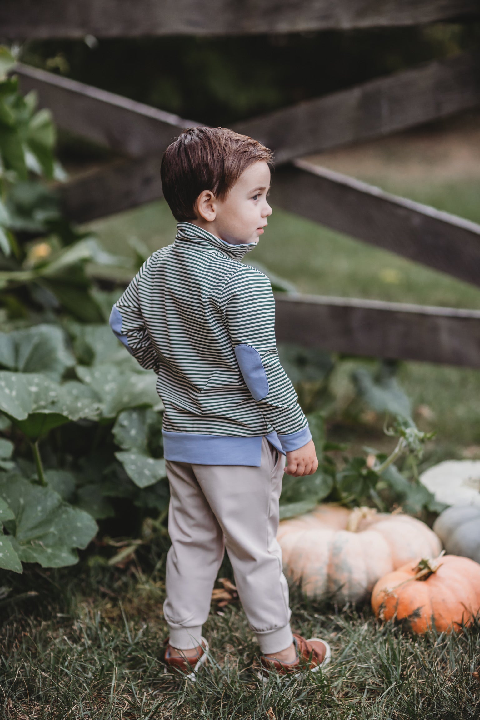 Cozy up in style with this playful sage pullover, featuring charming stripes and eye-catching blue elbow patches and cuffs. Perfect for adding a fun twist to your casual wardrobe while keeping you comfortable all day long.