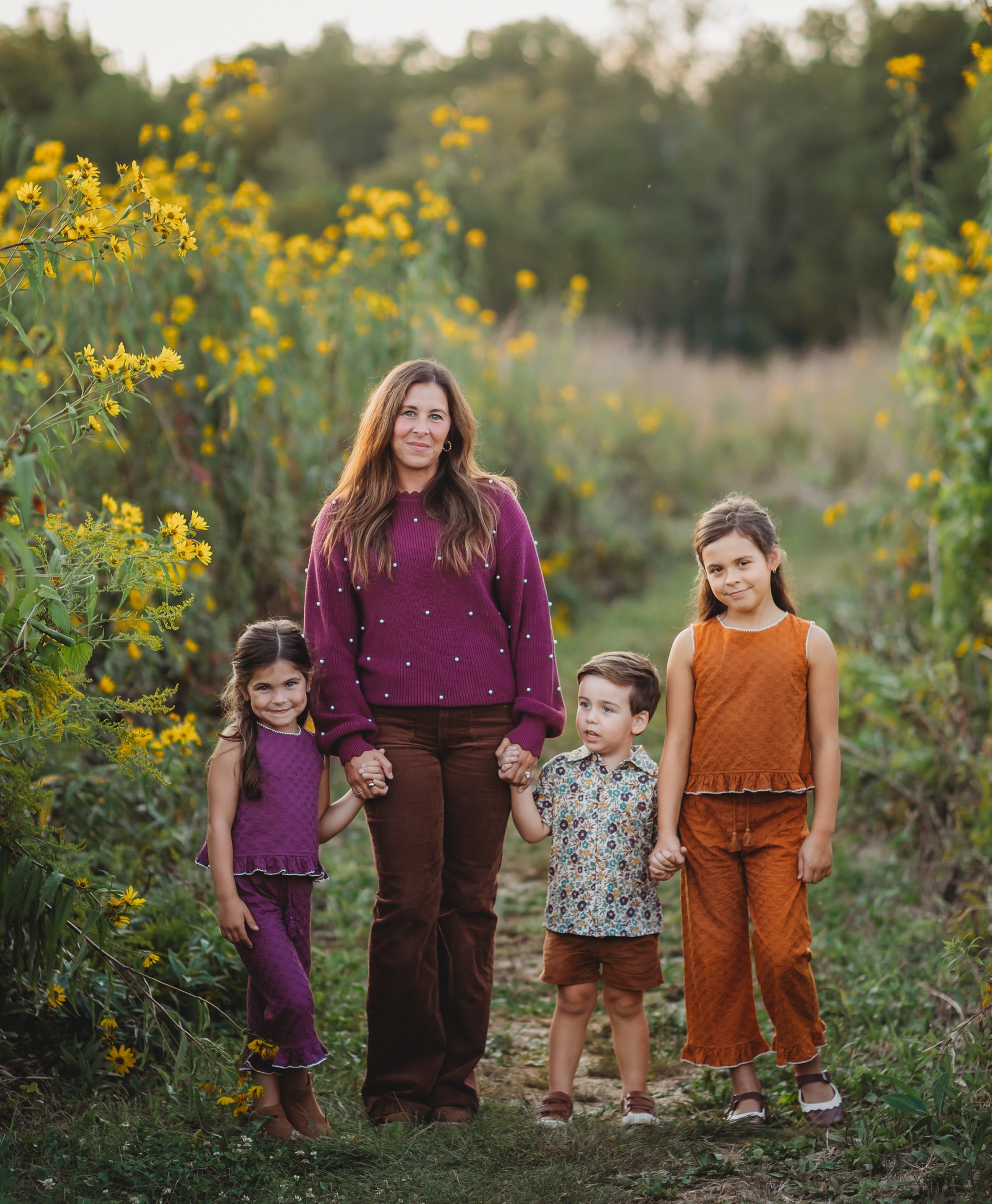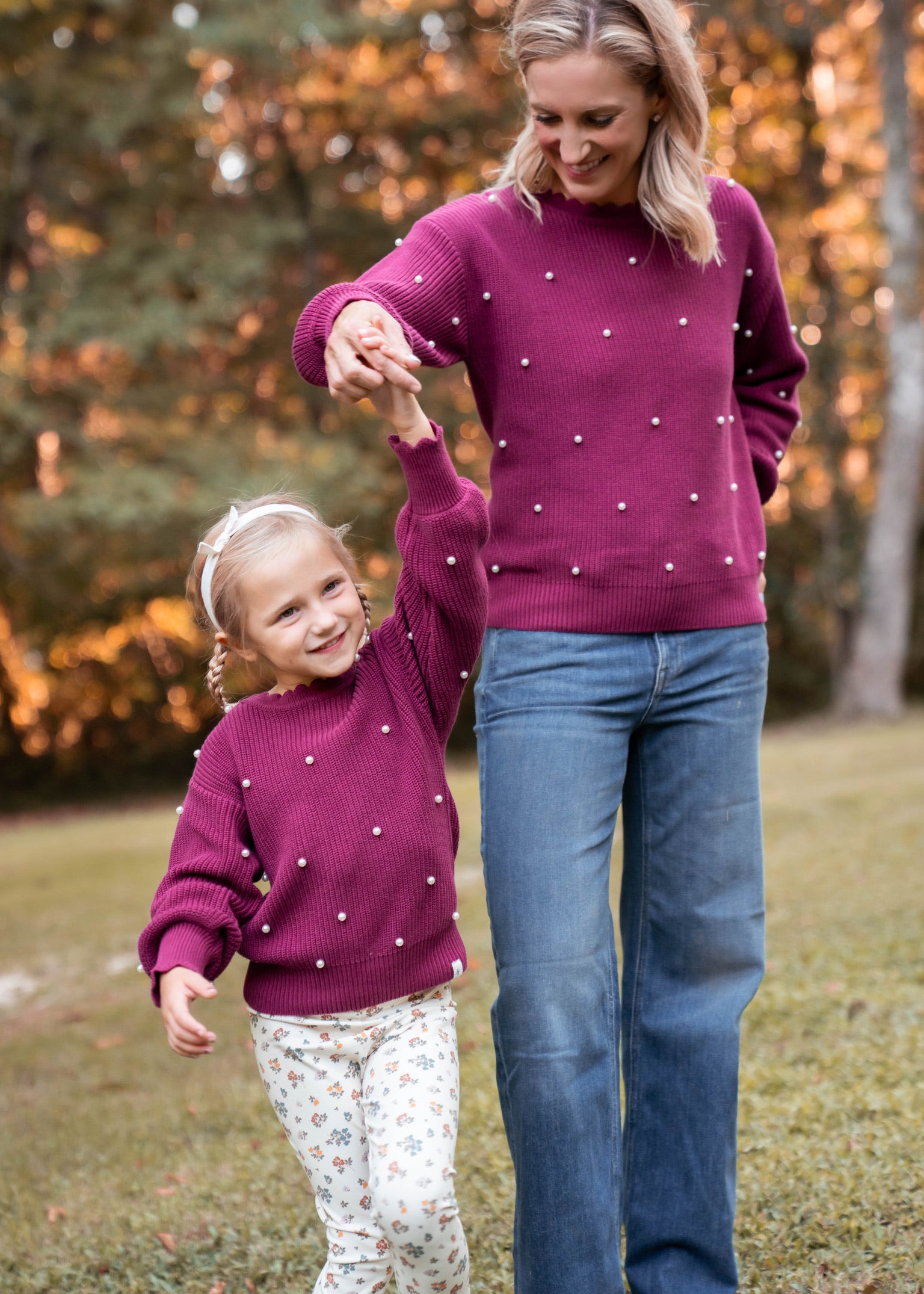 This rich orchid sweater, decorated with charming pearls, is a delightful way to match your little one in style. Soft and cozy, it adds a touch of whimsy, perfect for garden adventures or cozy days inside. Share the joy of twinning with your daughter in this sweet, statement piece.