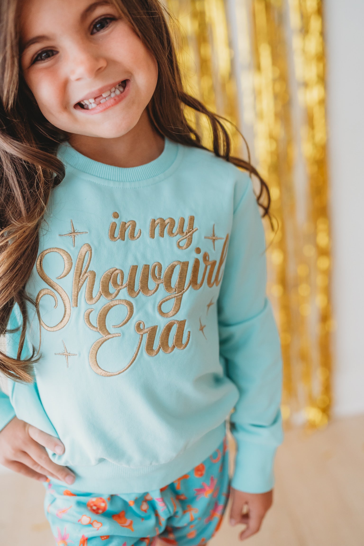 Step into the spotlight with our Showgirl Sweatshirt—a stunning aqua pullover adorned with shimmering gold embroidery that captures the glamour and confidence of center stage. Perfect for those who love bold fashion with a touch of theatrical flair, this cozy sweatshirt lets you wear your showgirl spirit wherever you go. Available for preorder, so you can claim yours before it sells out!