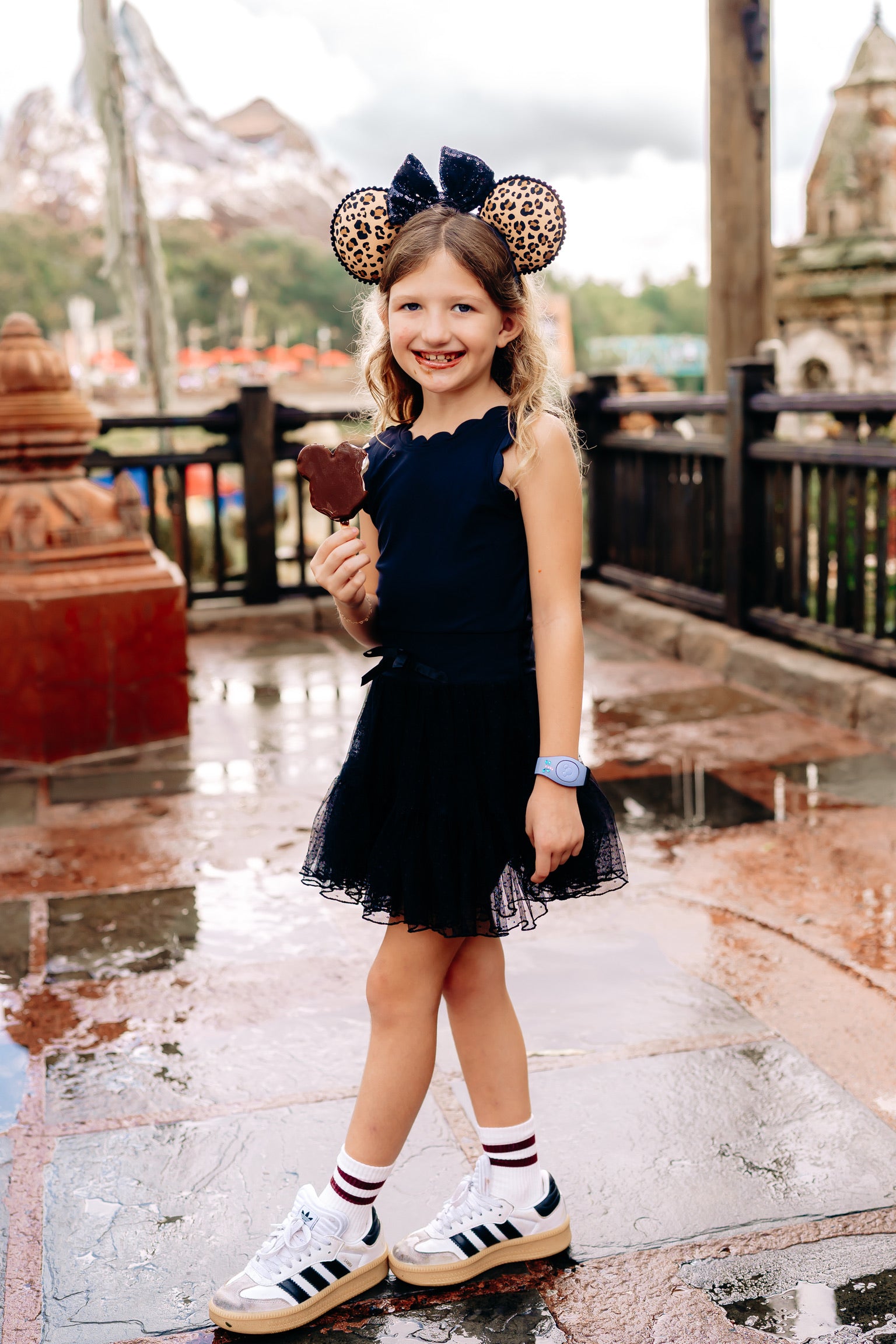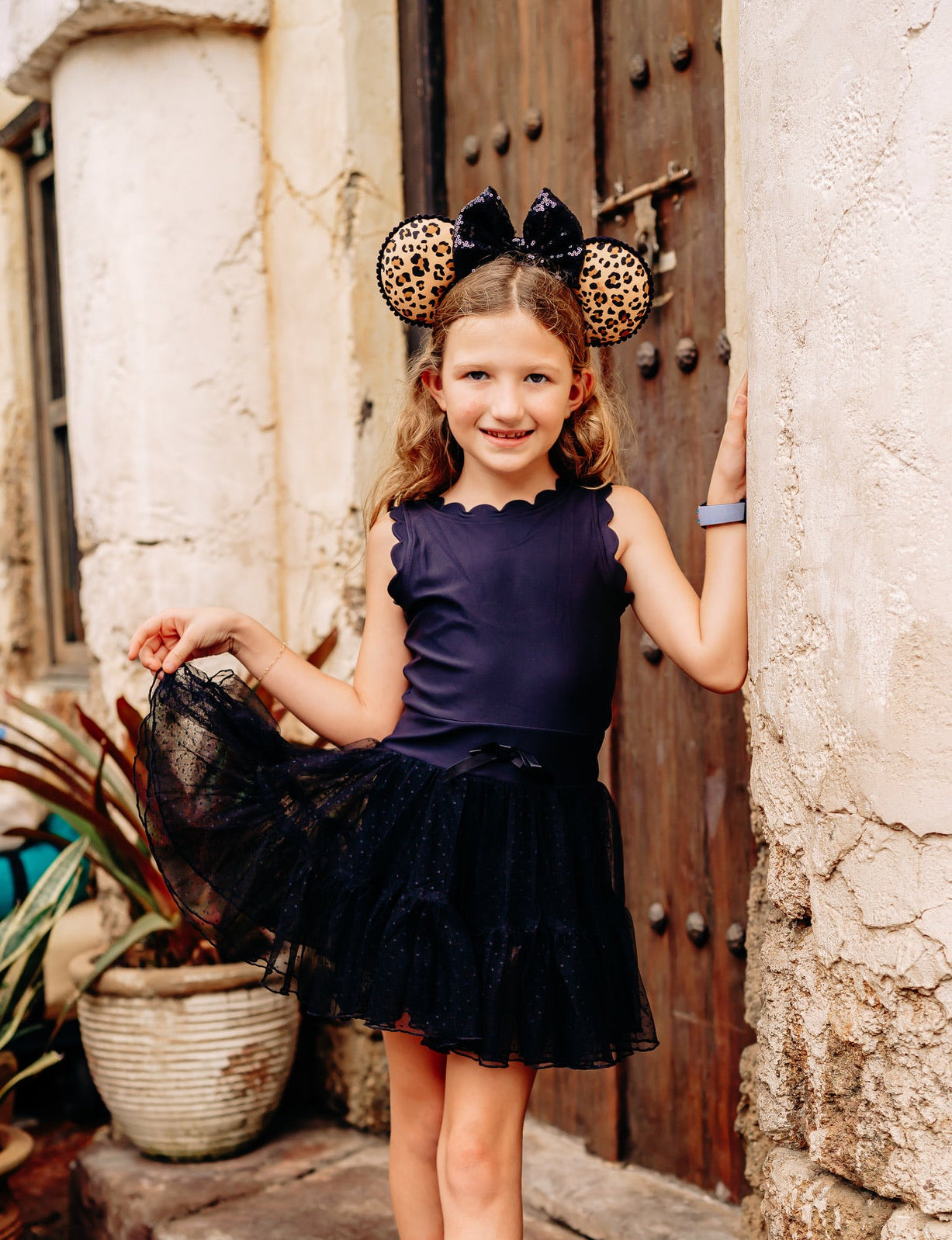 Meet your new favorite piece for playtime and beyond! This black athletic romper combines comfort with undeniable style, featuring a flowy tulle skirt overlay that twirls with every move. Delicate scallop accents add a touch of whimsy to the structured athletic base, creating the perfect balance between sporty and sweet. Whether she's conquering the playground or heading to a special occasion, this versatile dress delivers both performance and personality. Available for preorder now!