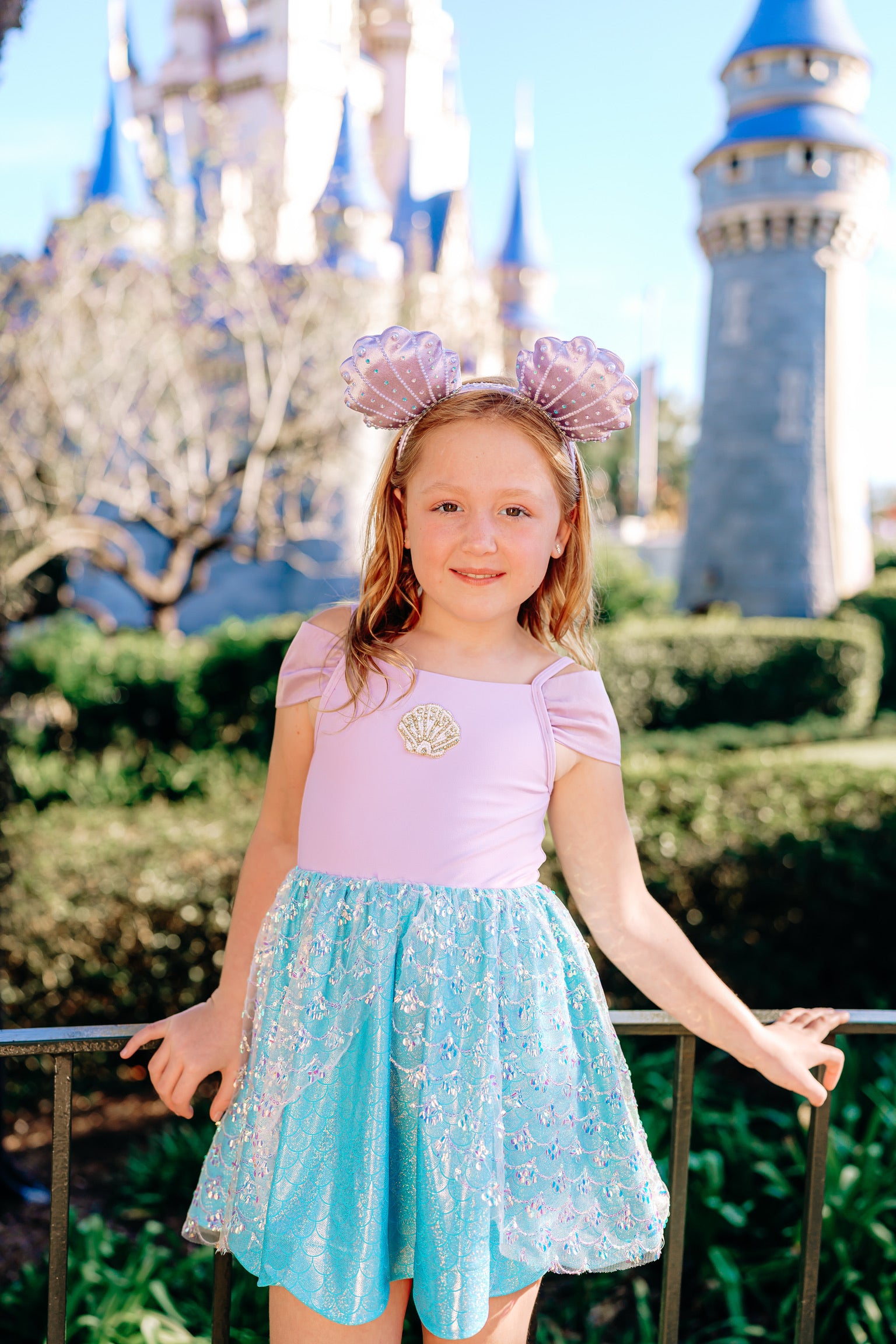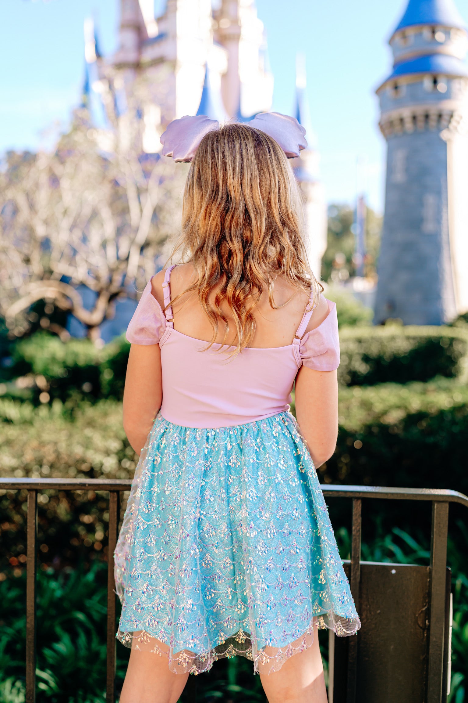 Make a splash on your next magical vacation with this Ariel-inspired athletic dress, designed for little mermaids who love to move, twirl, and explore. Featuring dreamy seafoam greens, ocean pastels, and subtle mermaid-scale inspired details, this sporty dress blends fairytale style with everyday comfort.