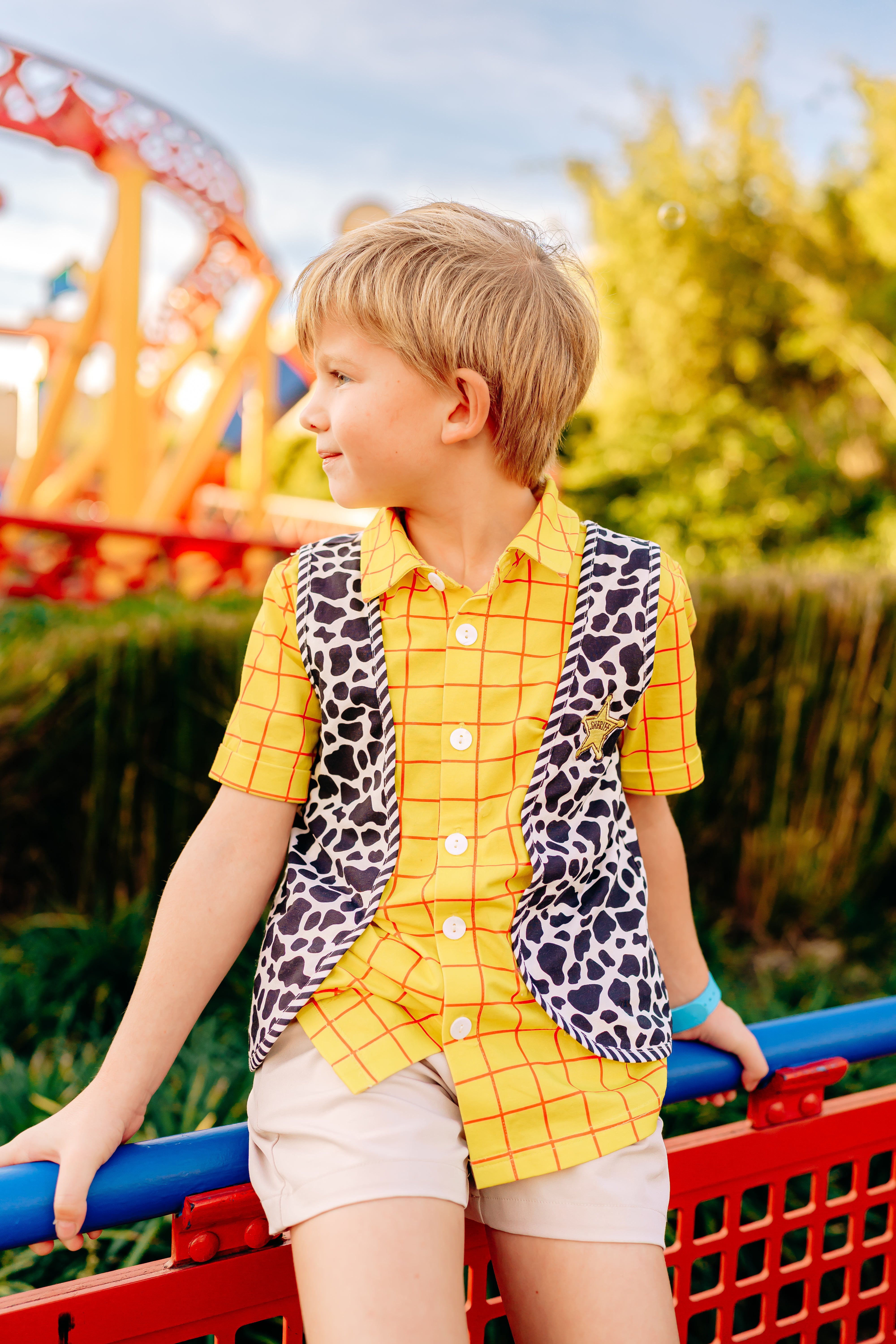 Featuring bold, western‑themed details and cheerful colors, this top brings big adventure energy with it's red and yellow check pattern and cow print vest. It’s an easy, fun choice for families who enjoy dressing in adventure‑themed outfits during vacations.