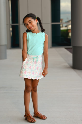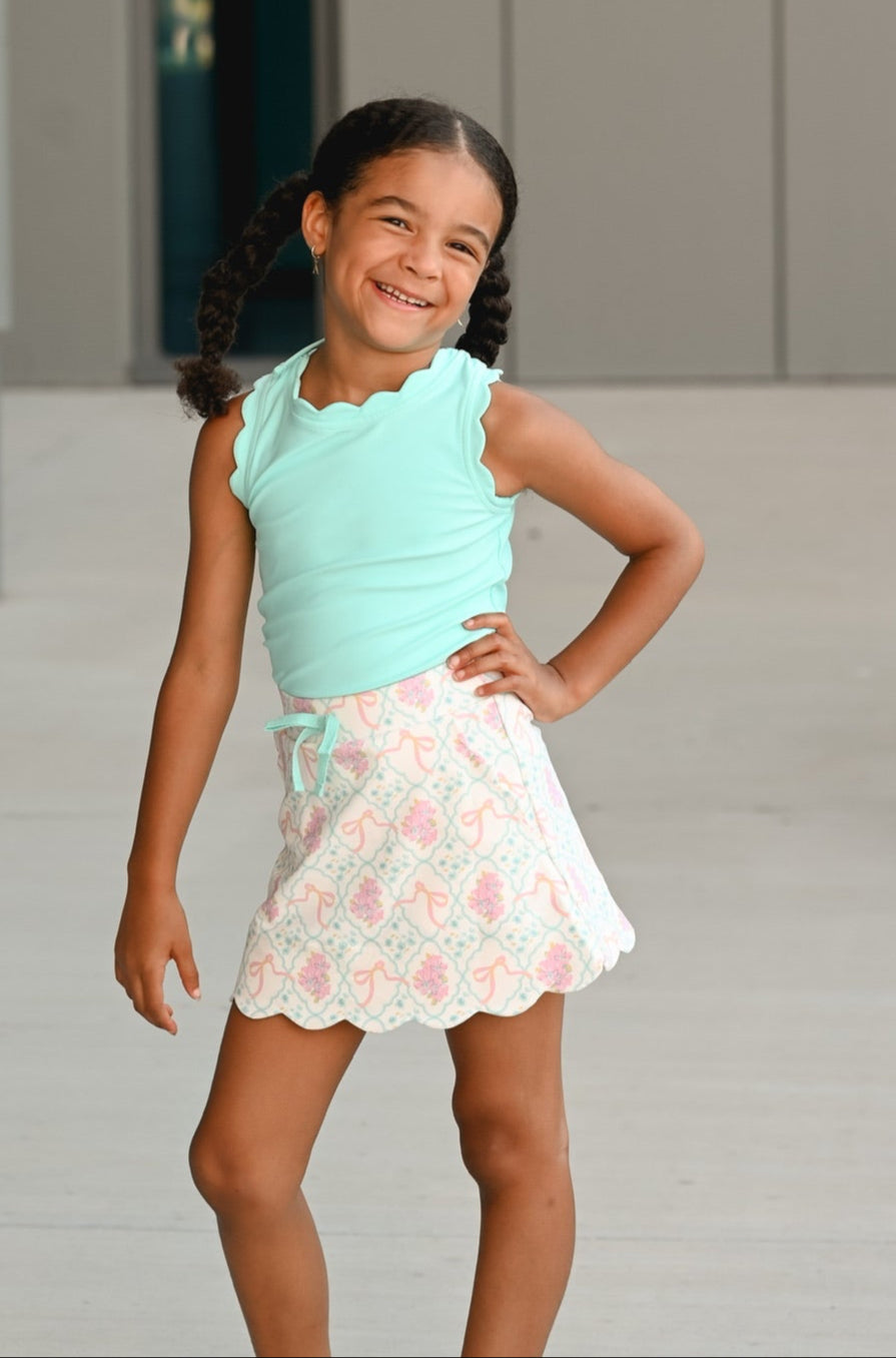 Get ready to turn heads with this playful skort and shirt Set! Featuring a sporty skort adorned with a charming floral and bow print perfect for active days and a scallop-edge top, this duo blends comfort with cute. Ideal for sunny outings or casual fun, it’s a fresh, flirty look that keeps you moving with style.