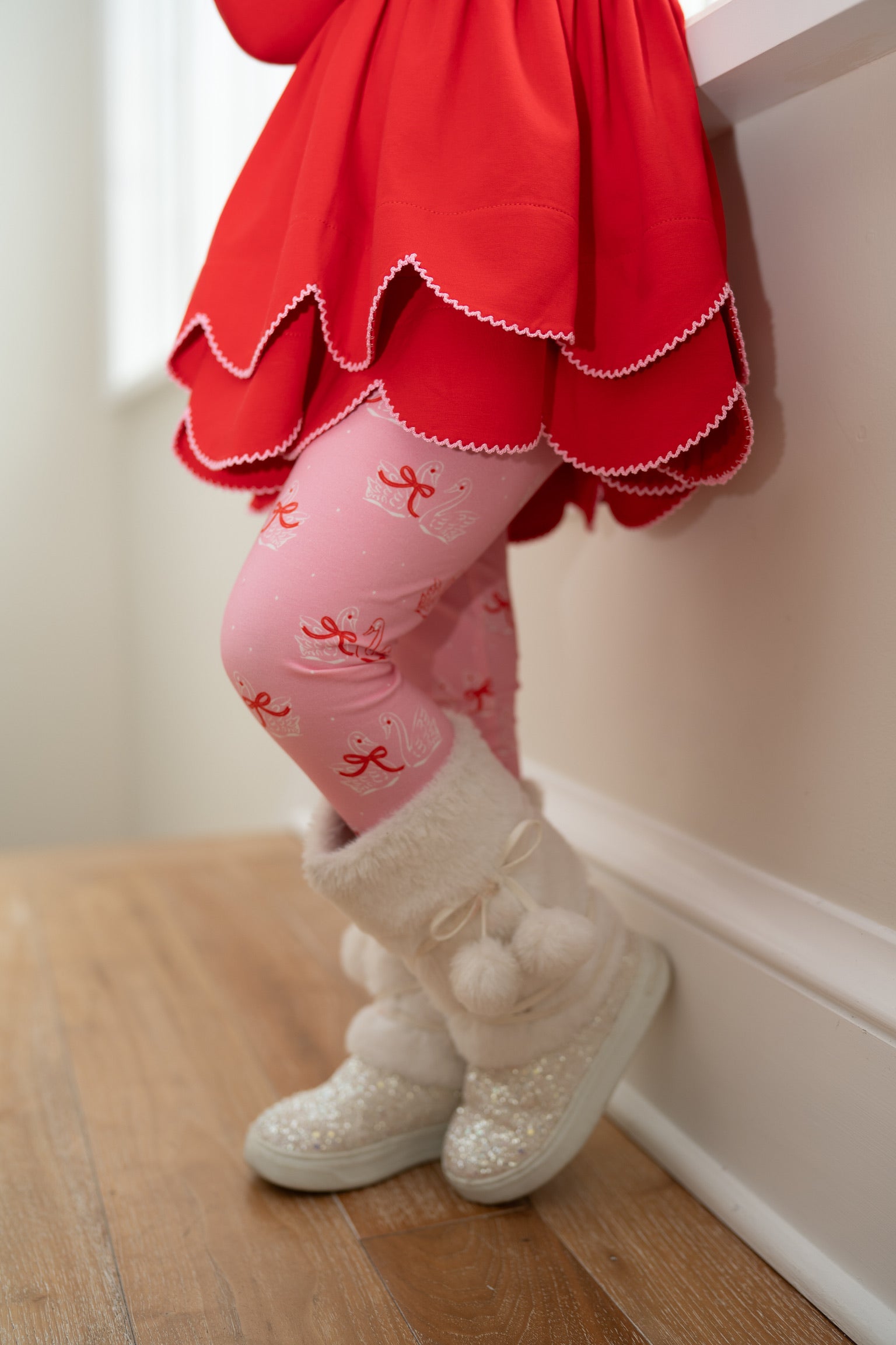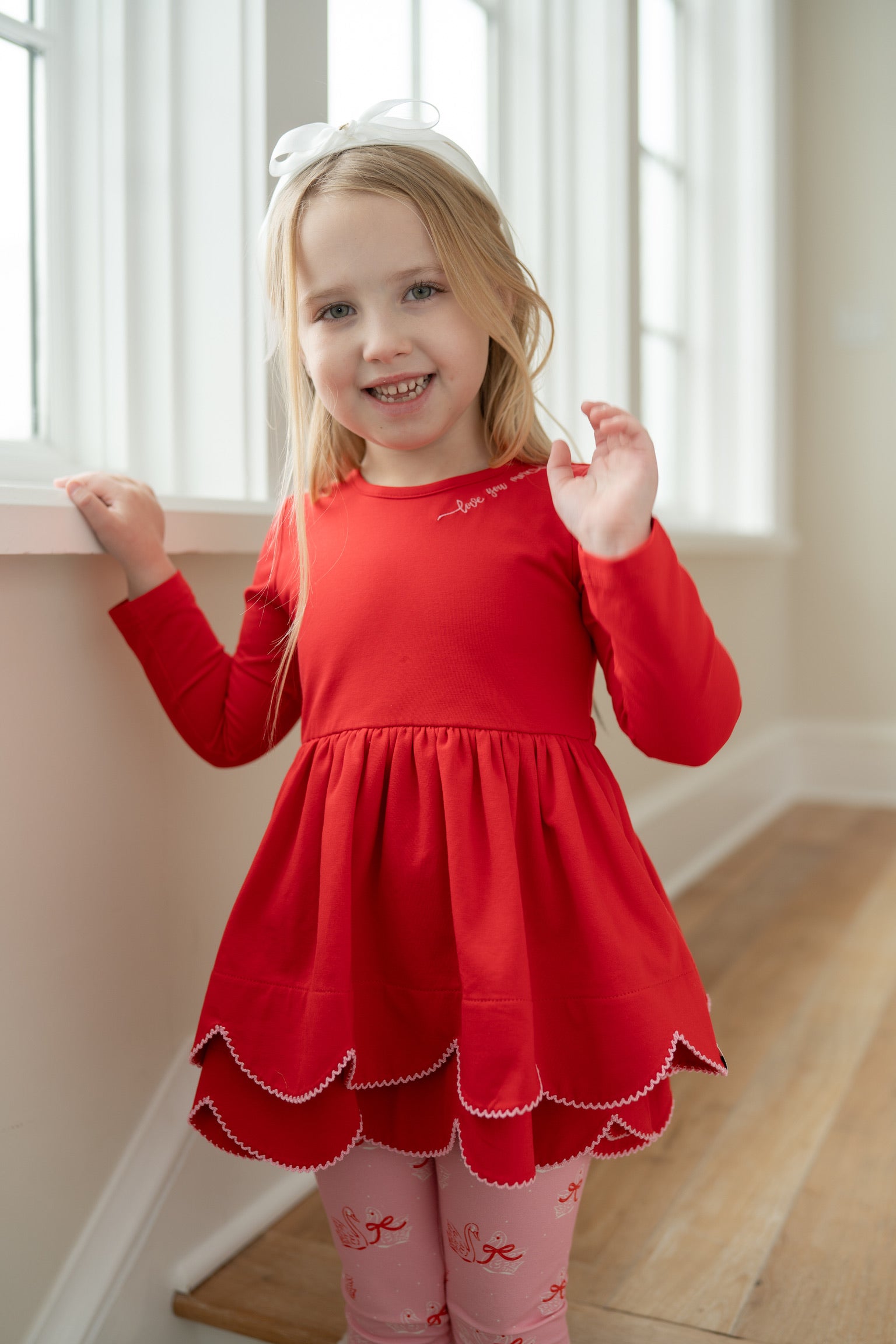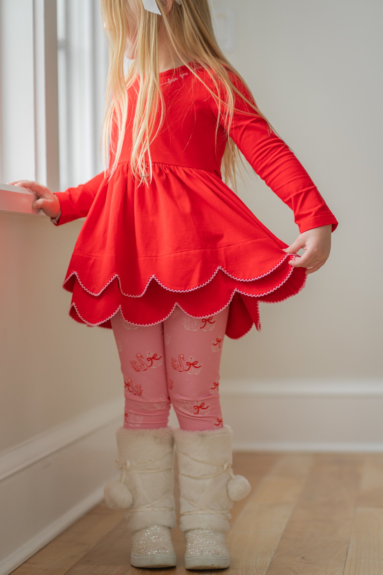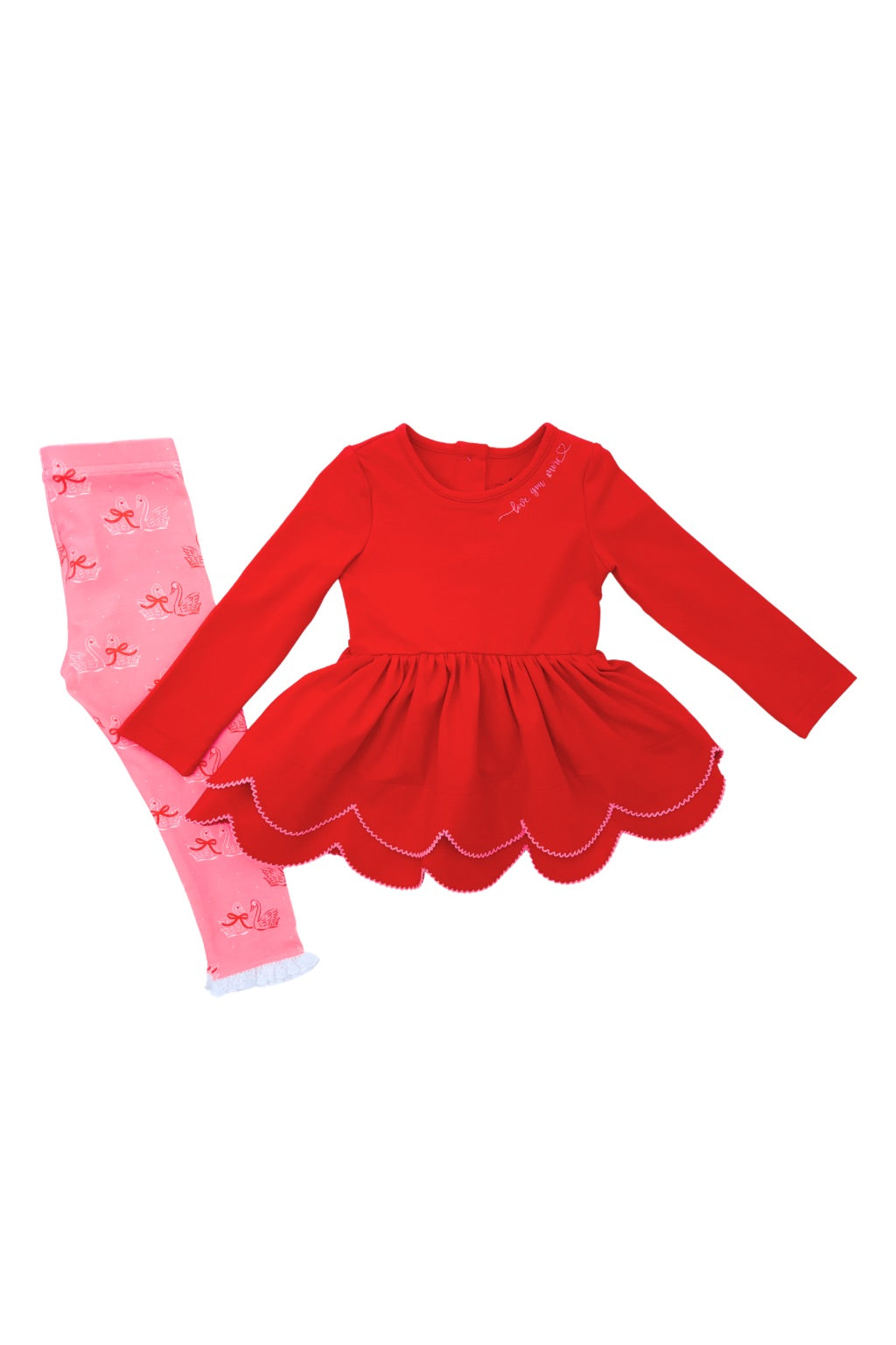 Cozy up in this adorable tunic set perfect for spreading love! The soft red top features a sweet "Love You More" embroidered detail at the neckline, paired with charming swan print leggings for a whimsical touch. Ideal for Valentine's Day celebrations or everyday comfort, this set combines heartfelt style with playful elegance. Mix and match with your favorite accessories for endless outfit possibilities.