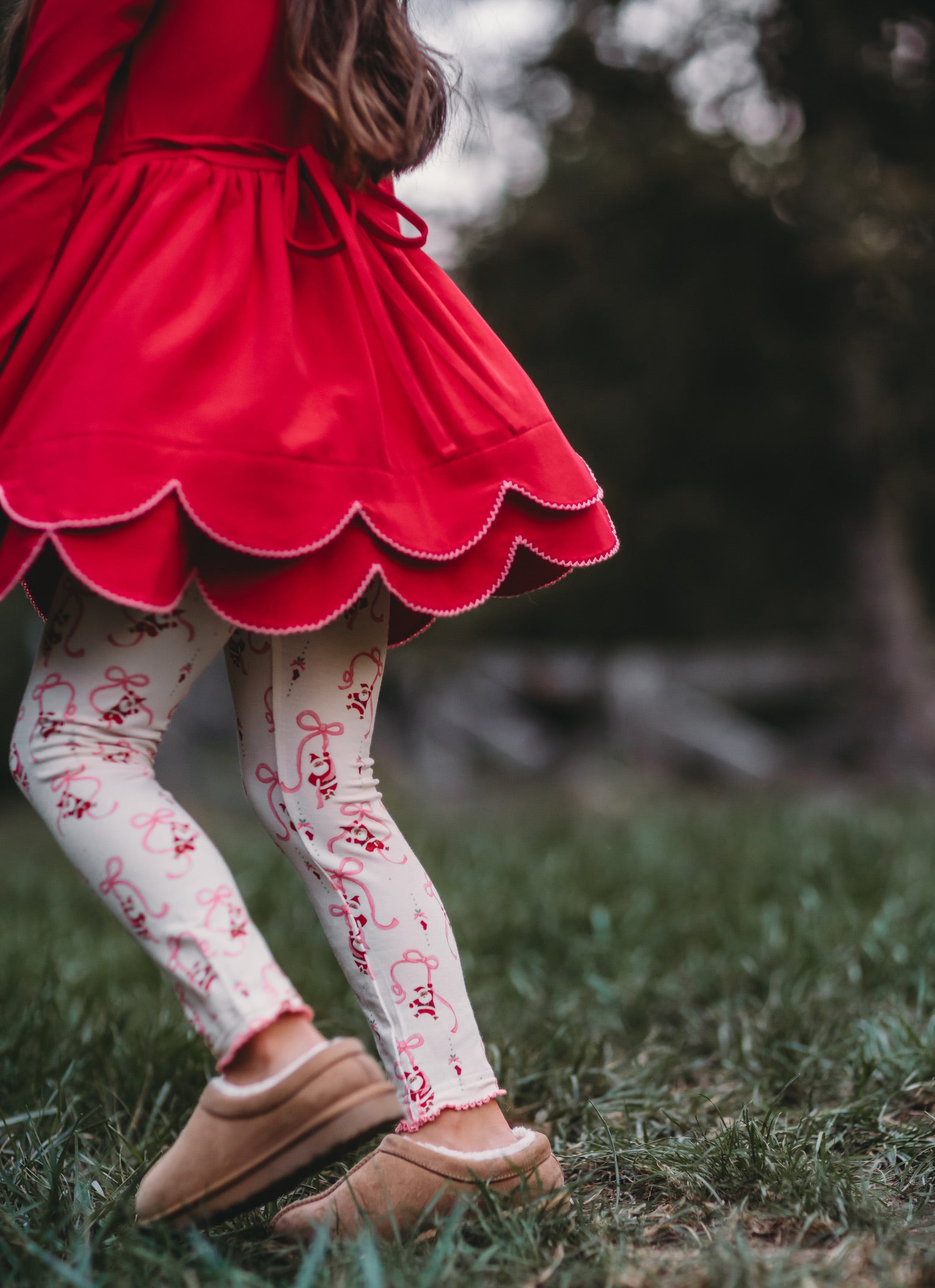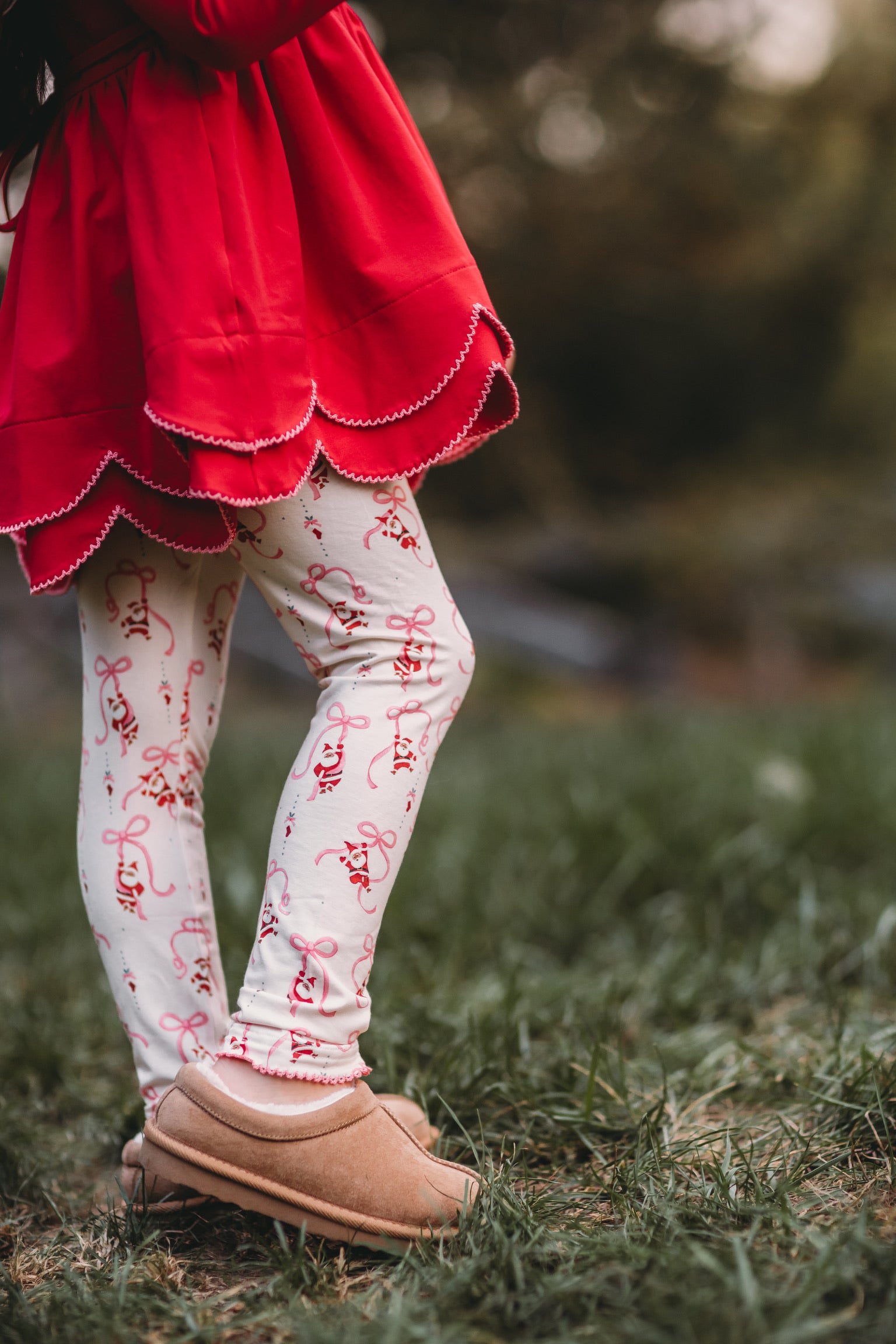Celebrate the season in style with the Merry and Bright Scallop Tunic Set! This playful outfit features a charming scallop-edge tunic embroidered with festive "Merry and Bright" lettering, paired perfectly with vibrant Santa print leggings. Cozy and cute, it's the ideal ensemble for holiday gatherings or fun-filled winter days. Let your little one shine with this joyful set that brings a dash of holiday cheer to every step!