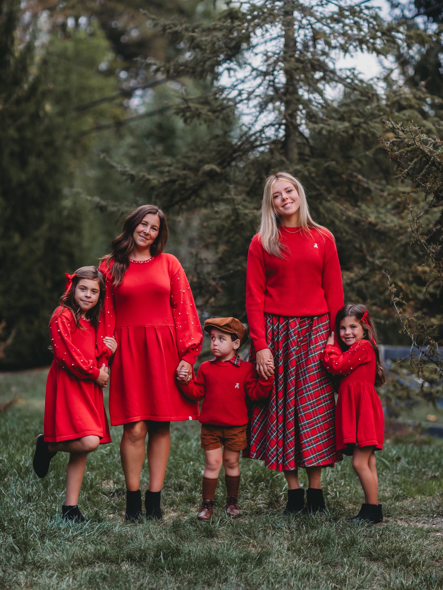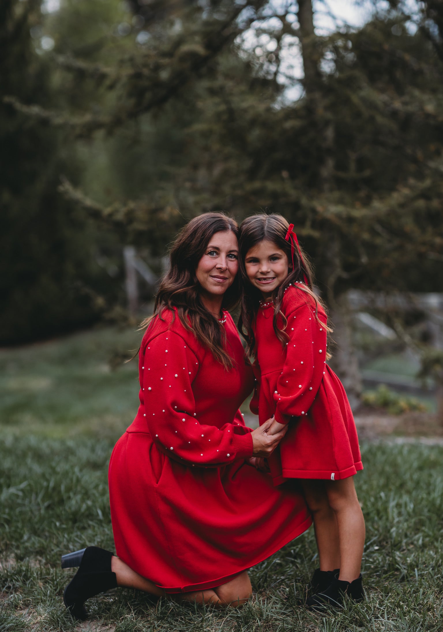 Cozy up in this playful red knit dress adorned with charming pearl details on the sleeves, adding a touch of sparkle to your holiday look. Designed to perfectly match the girls’ dress, it’s an ideal choice for festive family moments full of warmth and style. Whether it’s a holiday party or a cozy night in, this dress brings joyful elegance with every wear.