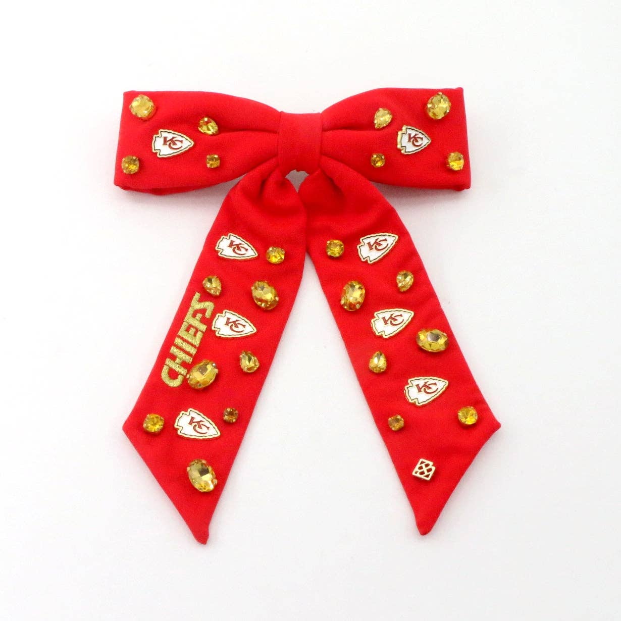 * Red Bow Barrette with Kansas City Chiefs gold plated logo charms and hand-sewn resin pearls and crystals