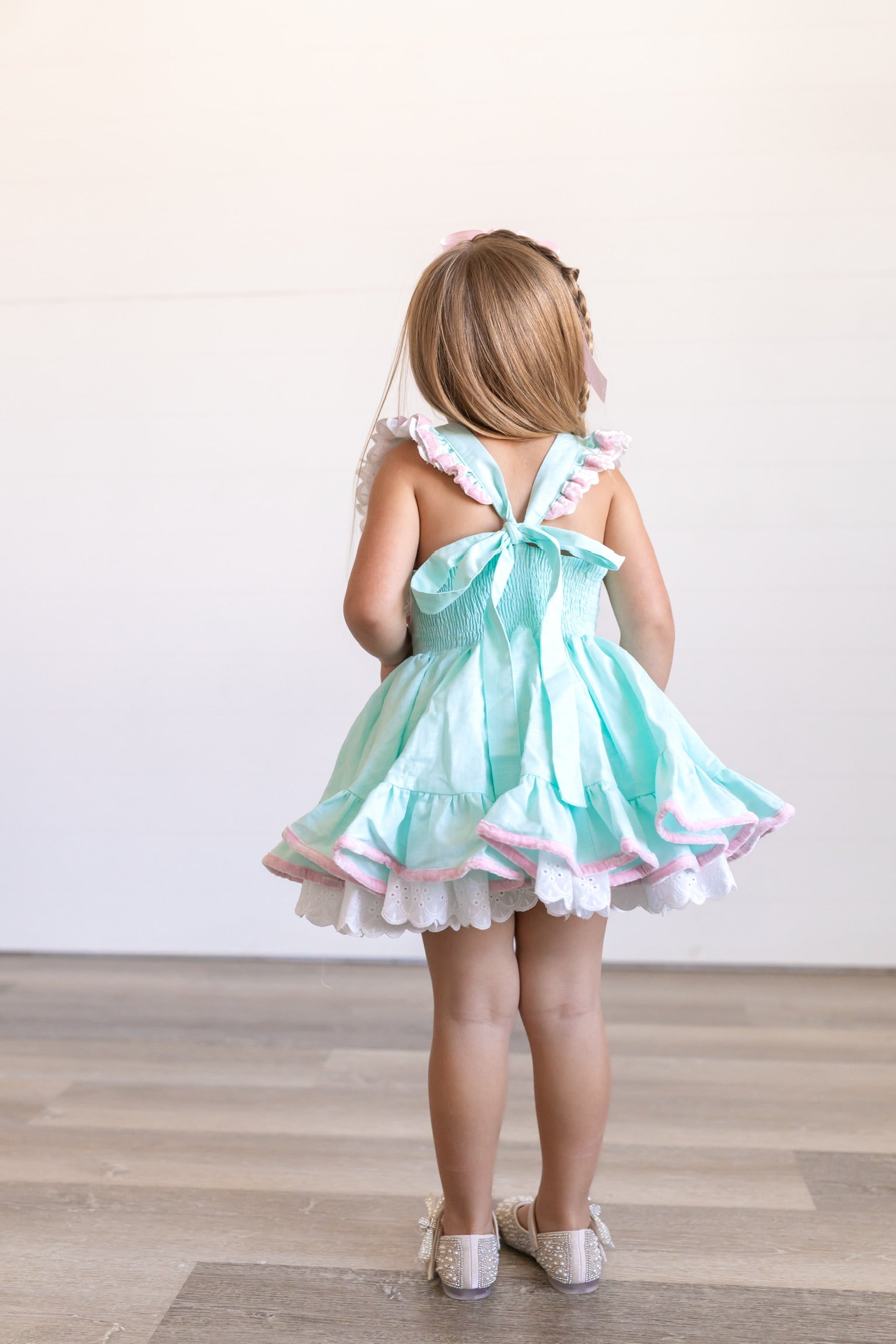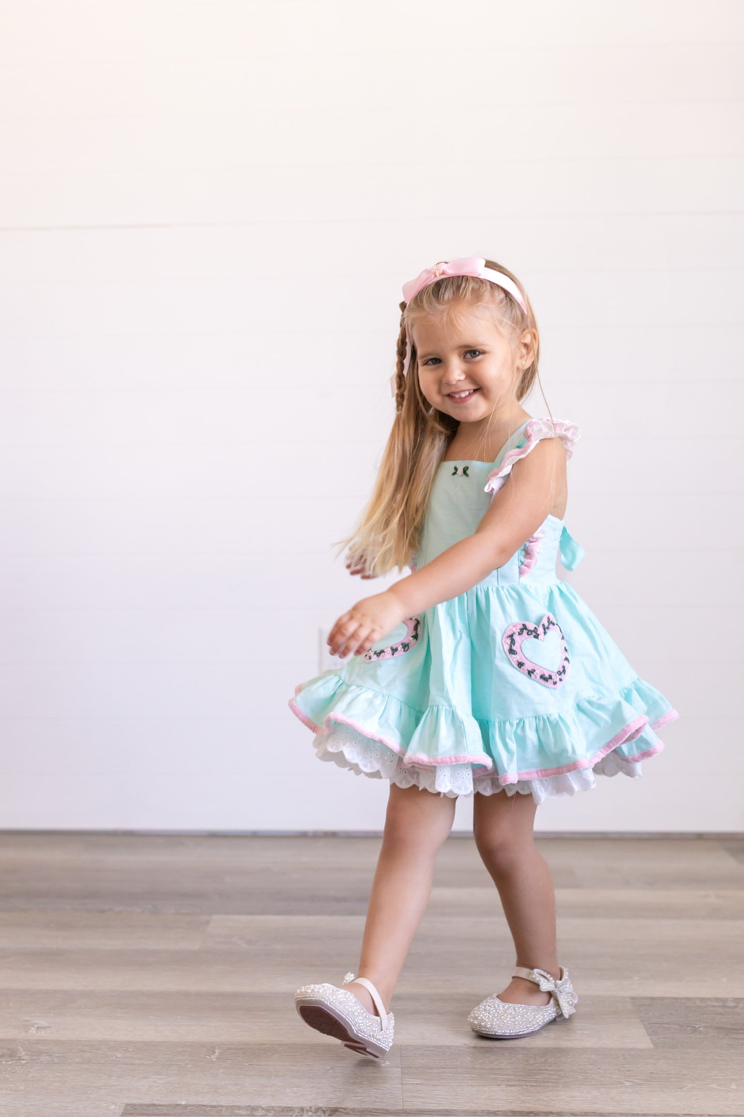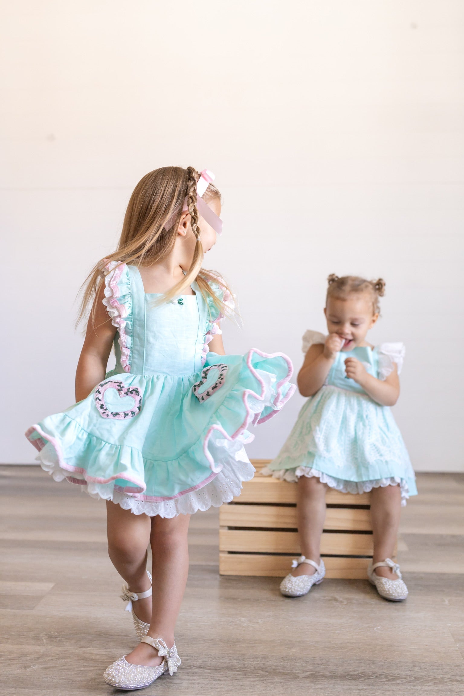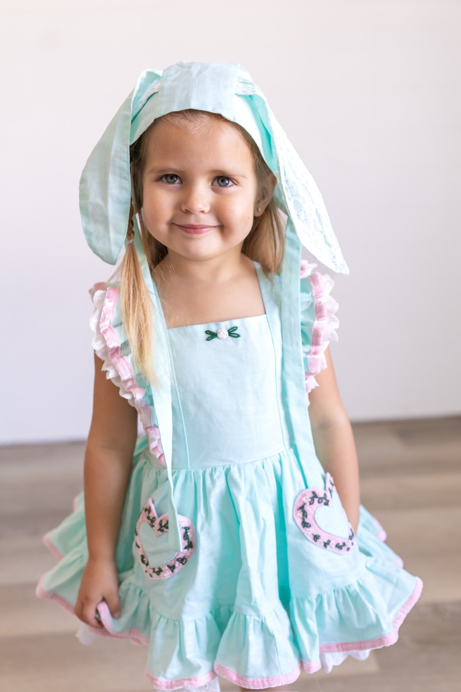 Hop into spring with this charming mint linen pinafore, perfect for Easter celebrations and beyond! Crafted from soft linen with luxe silk velvet trim that adds a touch of elegance, this dress is as delightful as it is wearable. Available with or without the heart shaped embroidered silk velvet pockets.