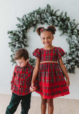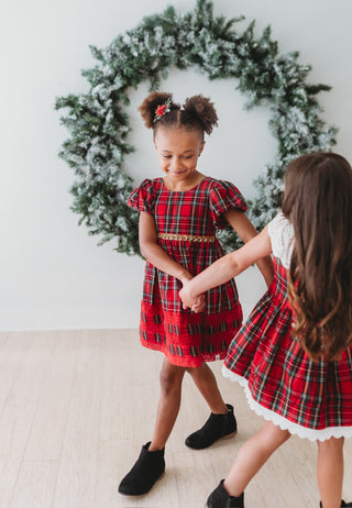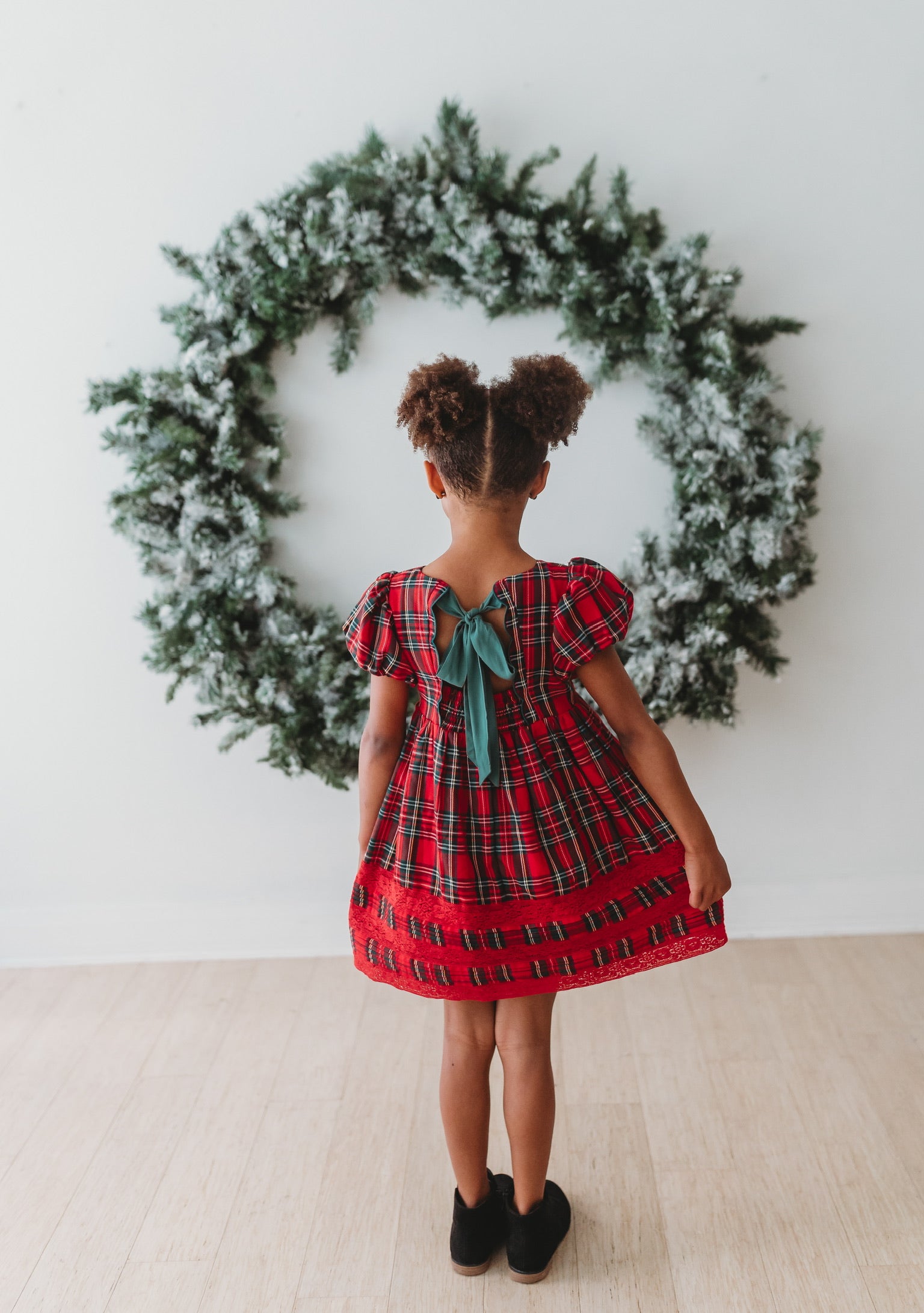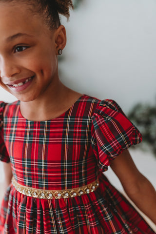 Get ready to sparkle this holiday season in our Christmas Tartan Charlotte Dress! Featuring a festive plaid pattern, a shimmering gold waistband, and delicate lace accents, this dress brings playful charm and classic holiday cheer to any celebration. Perfect for twirling under the mistletoe or cozy family gatherings, it’s a joyful choice for your little one’s festive wardrobe.