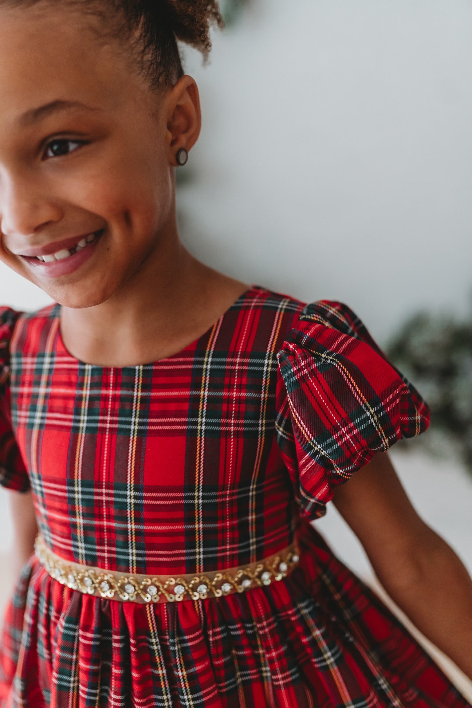 - Christmas tartan plaid dress with gold embellished waistband, lace accents and scallop back detail