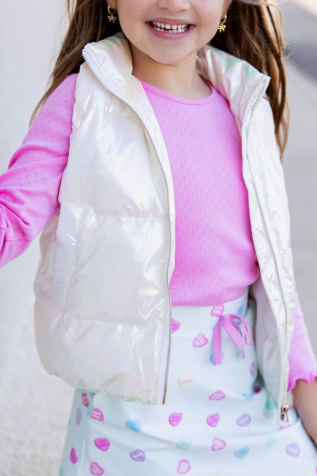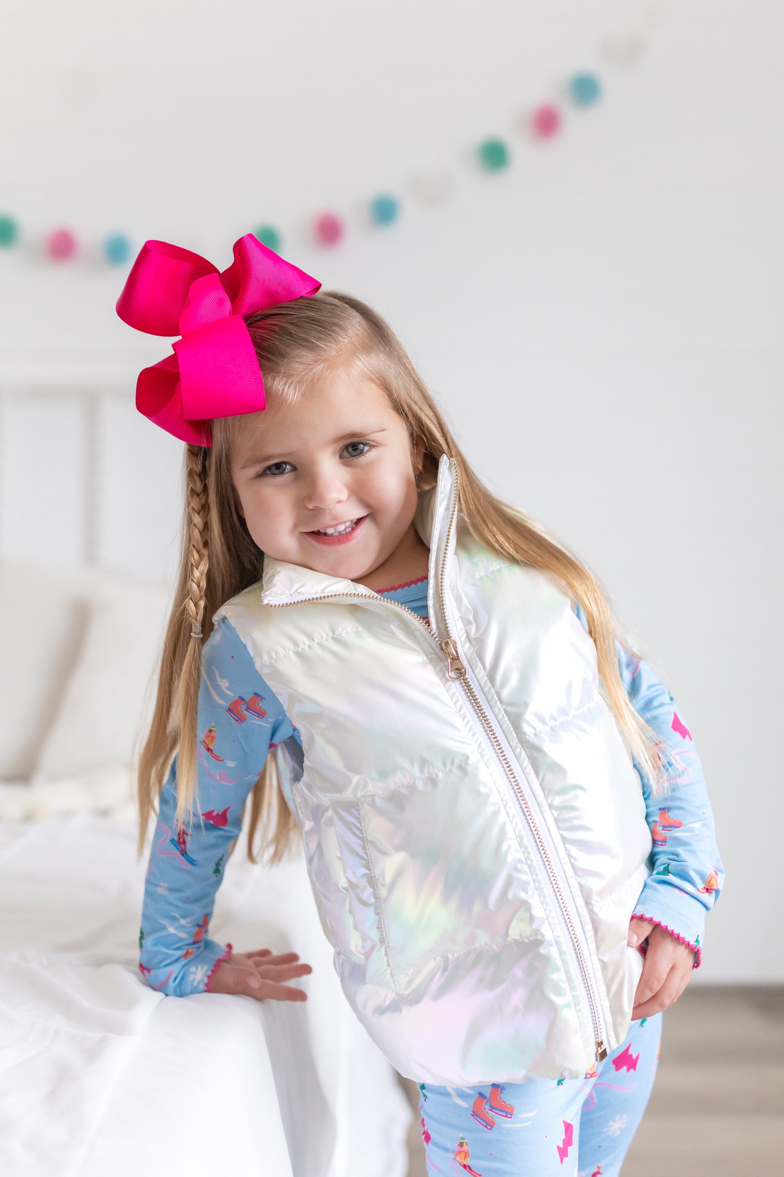 Wrap yourself in winter magic with the Snow Angel Vest, featuring a shimmering pearly iridescent finish that catches the light with every move. This cozy down-filled layer delivers serious warmth without the bulk, making it perfect for layering over your favorite tees or sweaters. The iridescent shimmer adds a touch of whimsy to any outfit, whether you're building a snowman or heading out for a day at the slopes. Lightweight yet toasty, this vest is your new go-to for chilly days filled with wonder and play.
